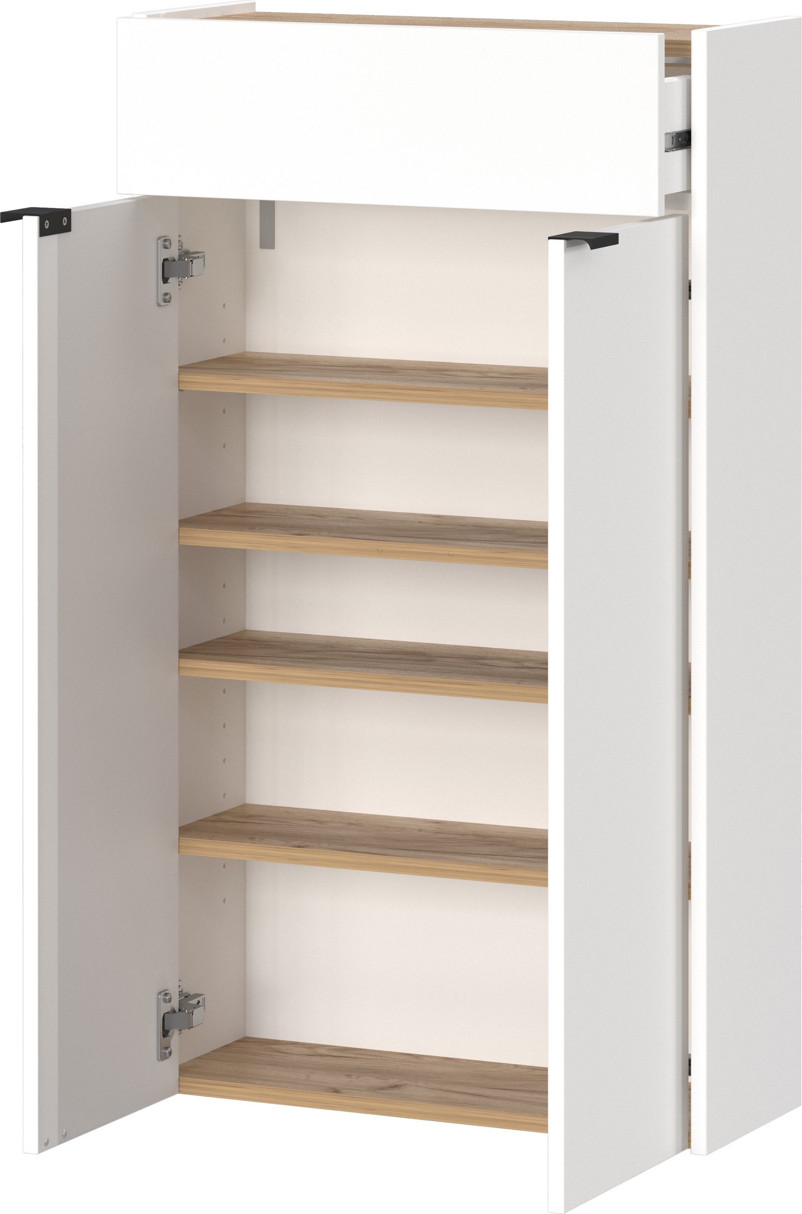Dodatkowa przestrzeń do przechowywania, piękny design i komfort – to właśnie zyskujesz dzięki szafce na buty „Ameca” firmy GERMANIA, którą można postawić lub zawiesić. Drzwi i szuflady zamykają się delikatnie dzięki mechanizmowi cichego domykania.