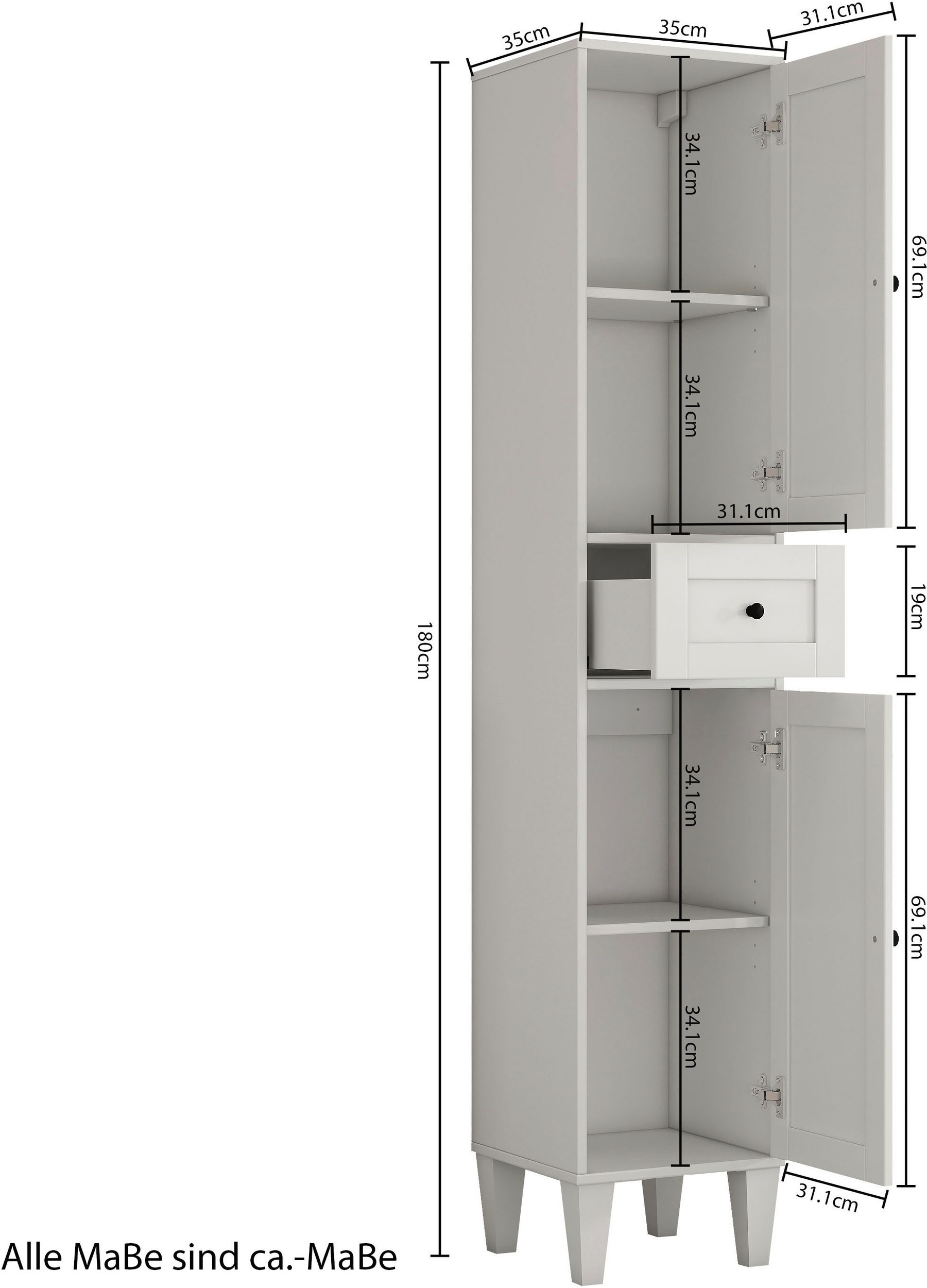 Szafka łazienkowa o wysokości 180 cm pozwala na efektywne wykorzystanie przestrzeni w pionie. Dwie komory (każda z dwojgiem drzwiczek) i jedna szuflada zapewniają uporządkowane przechowywanie.