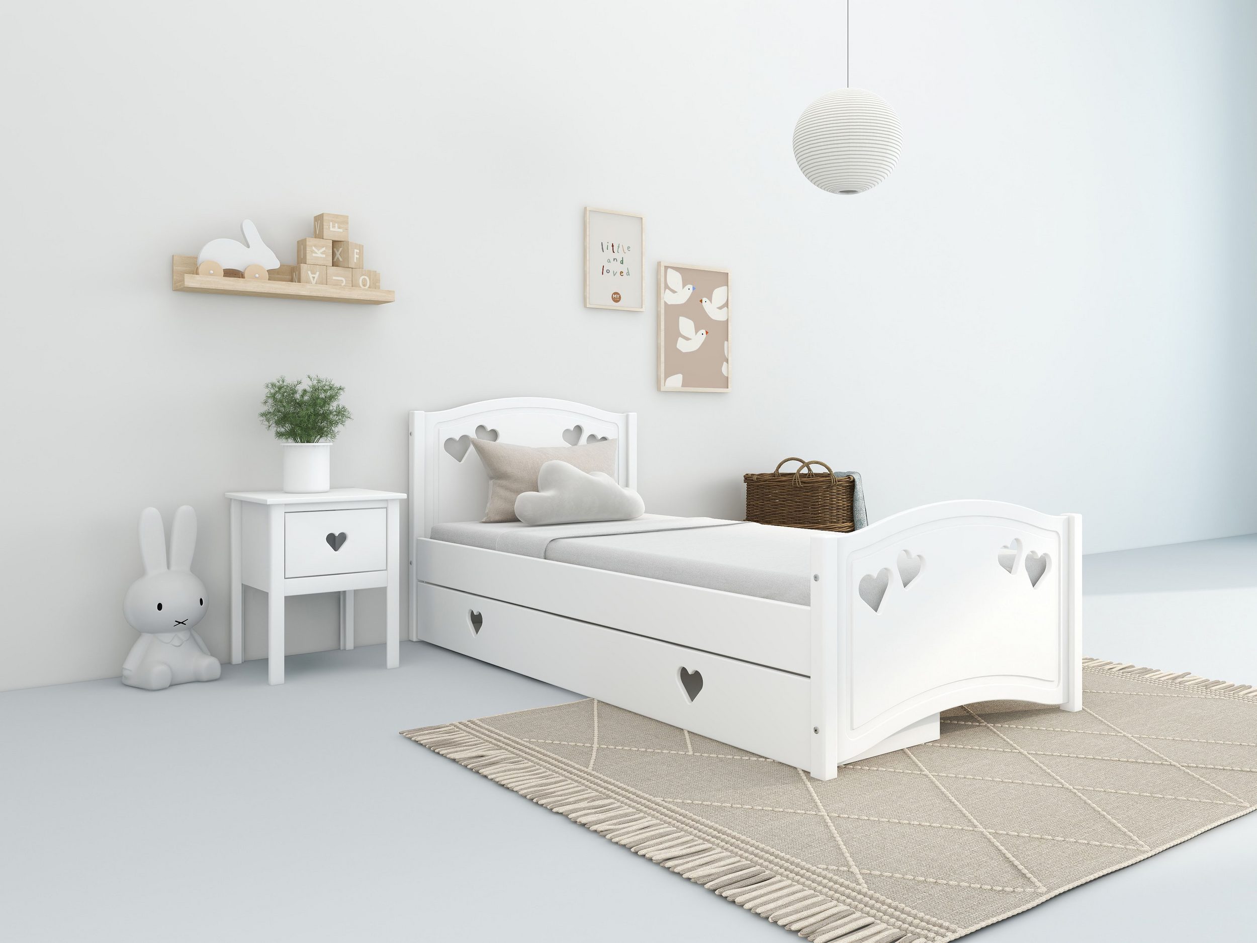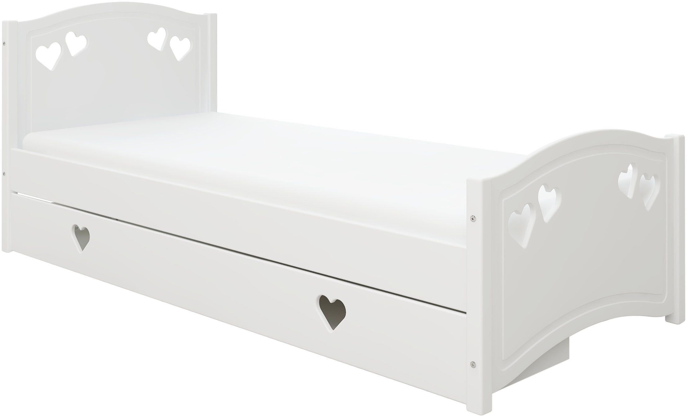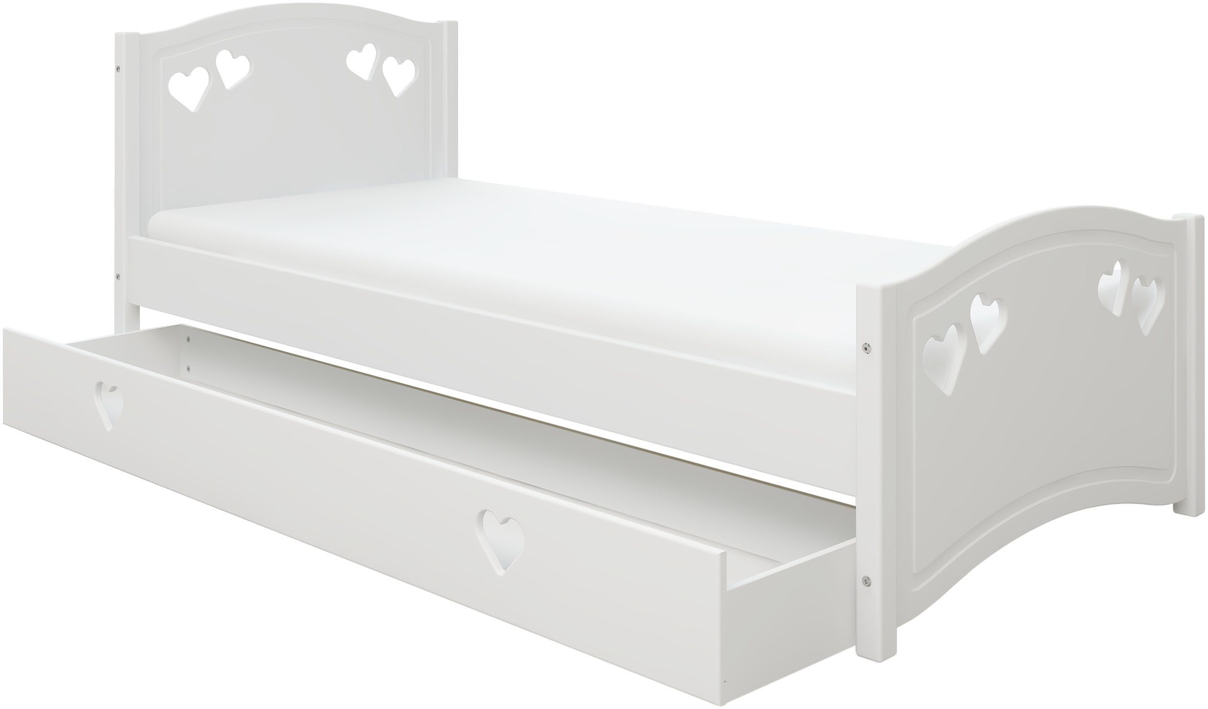 Białe łóżko dziecięce 90×200 cm z materacem i szufladą, ze wzorem serduszek
