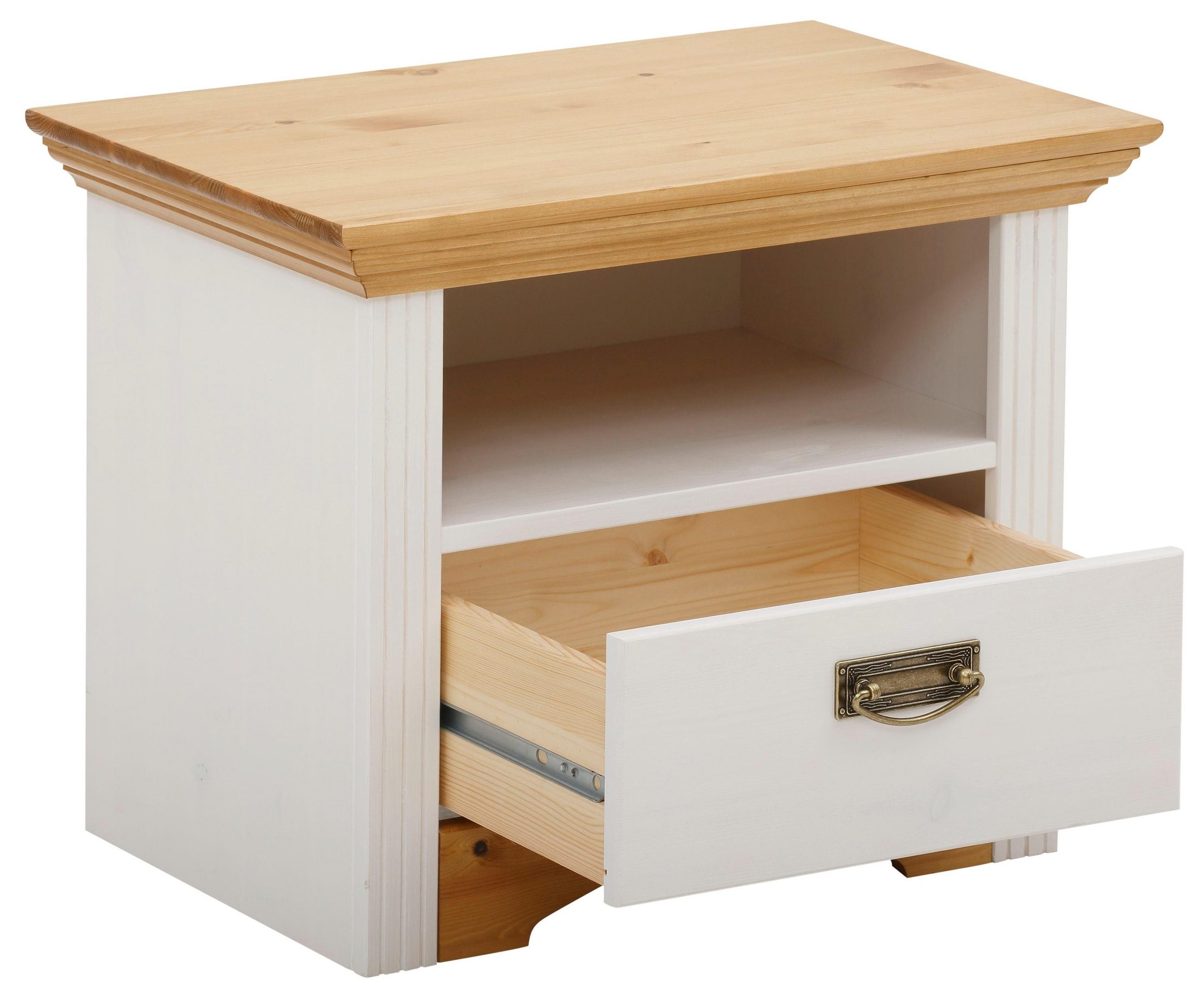 W górnej części szafki nocnej znajduje się otwarta przegroda o wymiarach wewnętrznych (szer./gł./wys.): 45/33/14 cm. Pod tą przegrodą znajduje się szuflada o wymiarach wewnętrznych (szer./gł./wys.): 35/30/13 cm.
