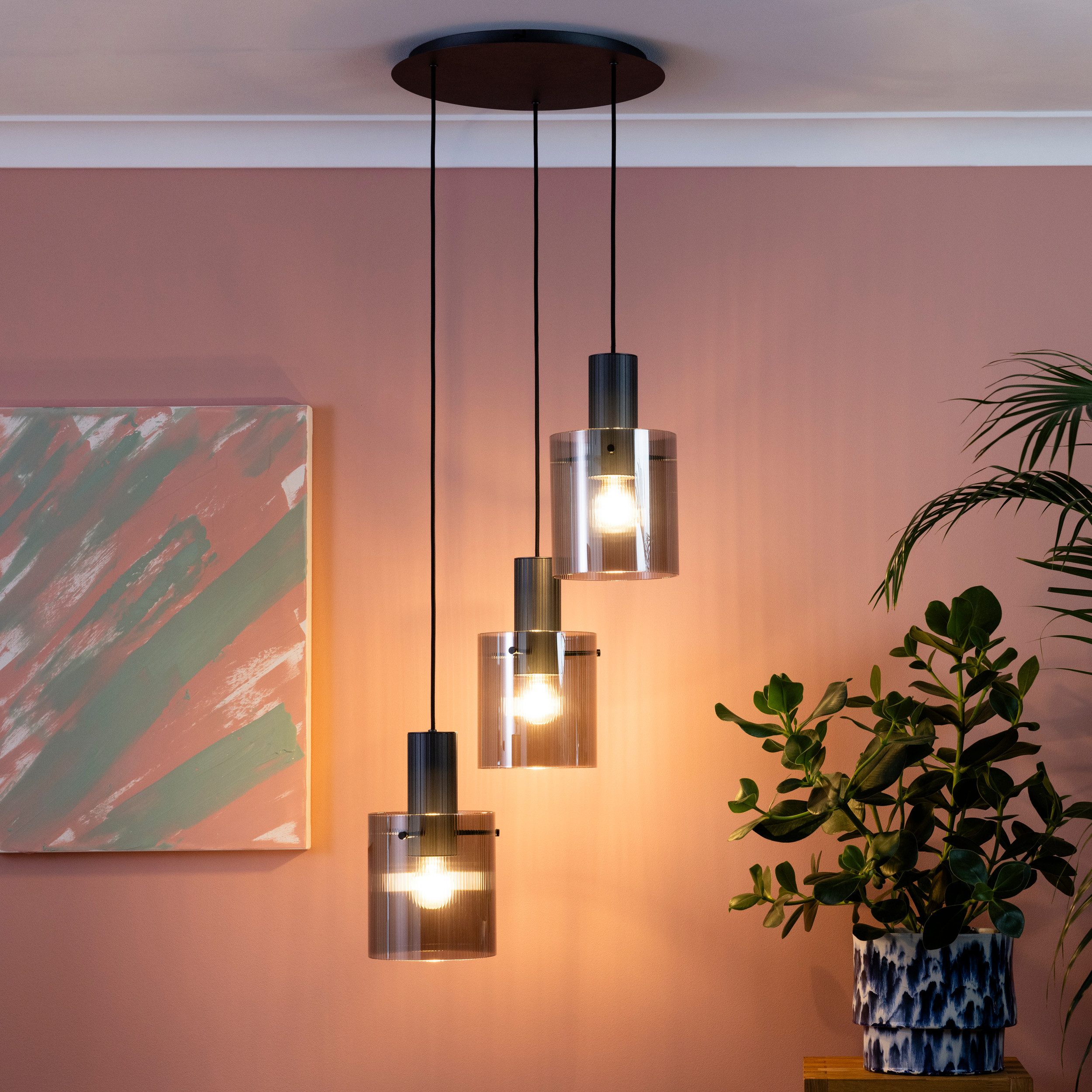 Dymane szklane klosze zapewniają przyjemną i ciepłą atmosferę. Rozproszone światło, wpadające przez przyciemniane klosze, tworzy przytulną i zachęcającą atmosferę, idealną do salonu, jadalni lub kuchni. Harmonijne rozmieszczenie trzech kloszy gwarantuje równomierne oświetlenie pomieszczenia bez efektu olśnienia.