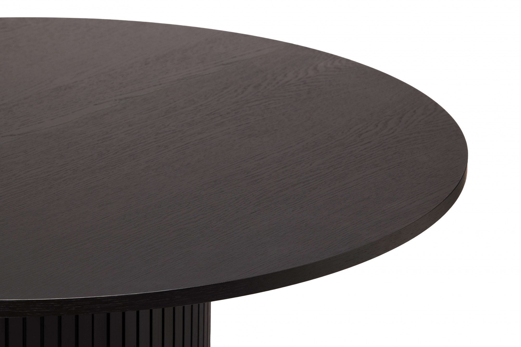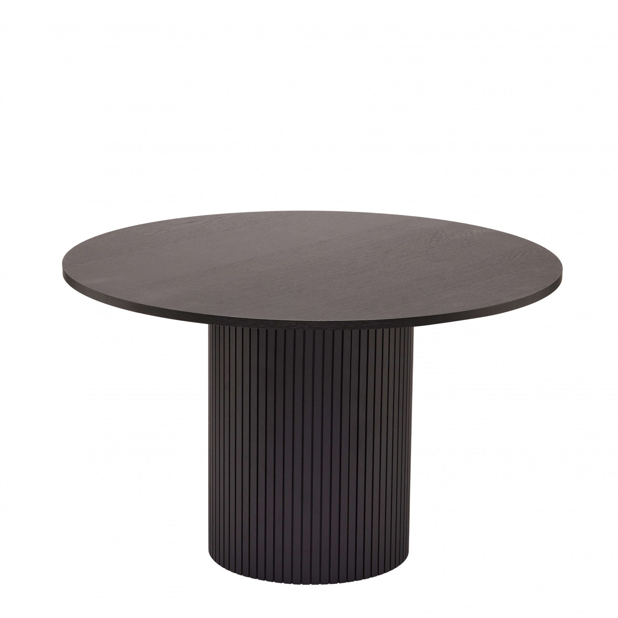Okrągły czarny stół fornirowany dębem, 125 cm średnicy, podstawa z frezowaniem