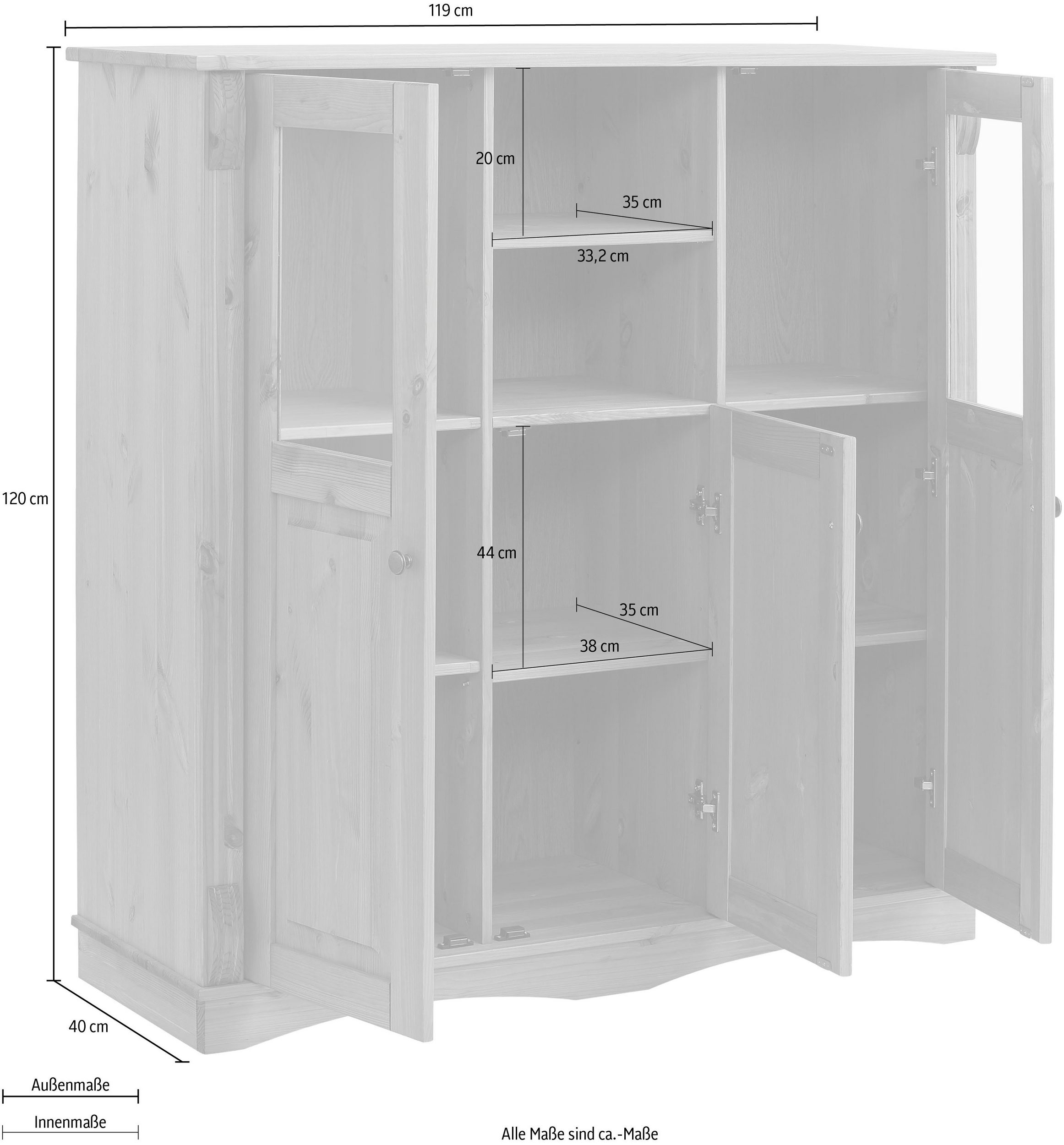 Komoda „Teresa” marki Home Affaire atrakcyjnie oddaje styl rustykalny. Liniowe frezowania po bokach nadają jej wyjątkowego charakteru. Szklane elementy z przodu oferują doskonałe możliwości wyeksponowania wazonów, książek i przedmiotów dekoracyjnych. Dostępne są również inne otwarte i matowe opcje przechowywania. Komoda to urokliwy mebel do salonu lub jadalni, idealny do przechowywania naczyń i sztućców. Dzięki swoim wymiarom mebel pasuje również do mniejszych pomieszczeń. Wykonana z wysokiej jakości litego drewna sosnowego, posiadającego certyfikat FSC®. Kredens „Teresa” marki Home Affaires dodaje uroku tradycyjnym domom w stylu rustykalnym.