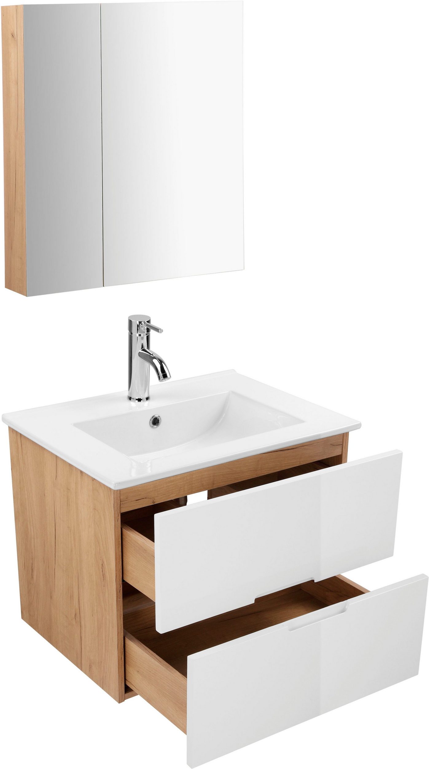 Szafki łazienkowe – szafka z lustrem i szafka z umywalką, biało-dębowe