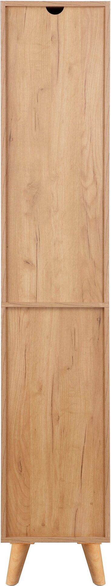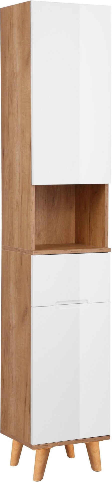 Wysoka szafka łazienkowa w skandynawskim stylu, dębowa z białym frontem w połysku