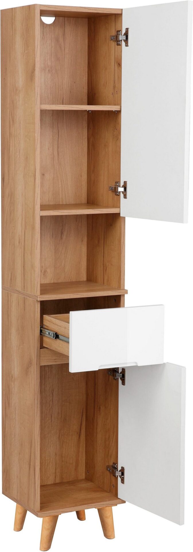Wszechstronna organizacja: dzięki różnym przegródkom, szufladom i drzwiom wysoka szafka umożliwia praktyczne i przejrzyste przechowywanie przyborów łazienkowych.