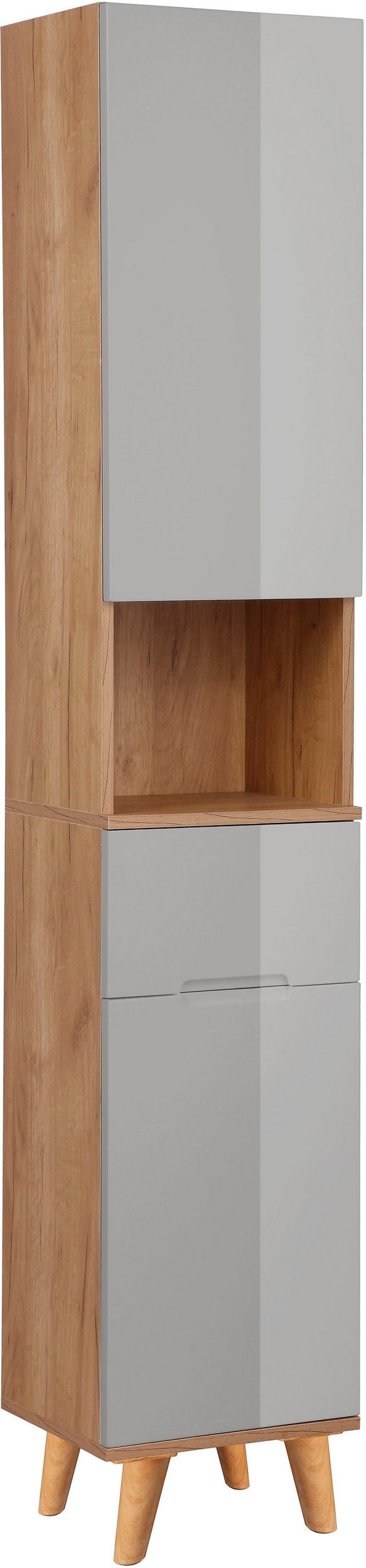 Wysoka szafka łazienkowa w skandynawskim stylu, dębowa z szarym frontem w połysku